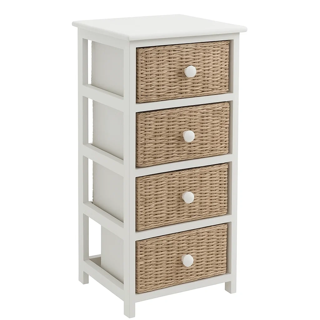 Cassettiera con 4 Cassetti in Rattan e Struttura in Legno MDF Bianco