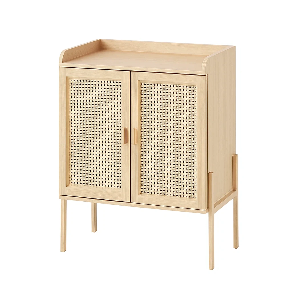 - Materiale: Struttura in legno di pino, ante in rattan intrecciato.
